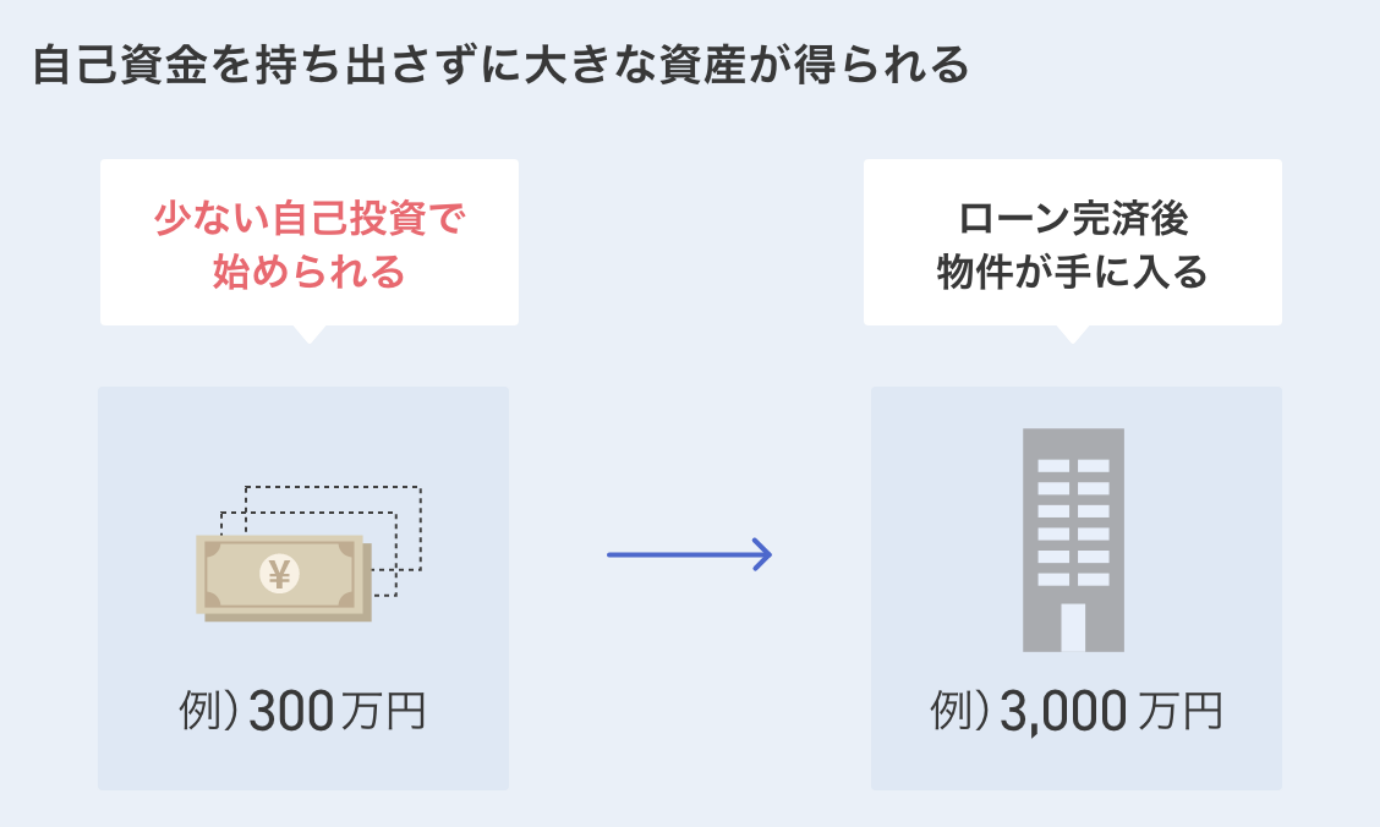 投資をする場合、通常は自分の手持ちのお金を使って投資商品を購入します。 しかし不動産投資の場合、不動産投資ローンを使って借入れをすることで、手元にあるお金をそれほど使わず投資をすることができます。ここが不動産投資の大きな特徴です。 自己資金は物件価格の1~3割程度用意していれば、始められるケースもあります。